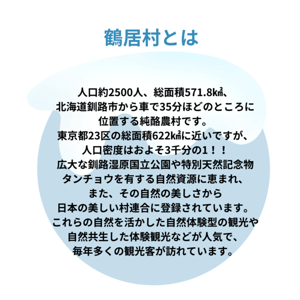 鶴居村は、人口約2500人、総面積571.8㎢、北海道釧路市から車で35分ほどのところに位置する純酪農村です。東京都23区の総面積622㎢に近いですが、人口密度はおよそ3千分の1!!とても長閑な村で、広大な釧路湿原国立公園や特別天然記念物タンチョウを有する自然資源に恵まれ、また、その自然の美しさから日本の美しい村連合に登録されています。これらの自然を活かした自然体験型の観光や自然と共生した体験観光などが人気で、毎年多くの観光客が訪れています。