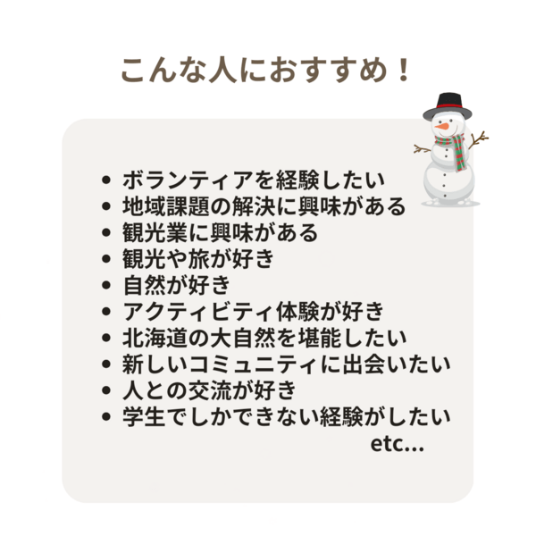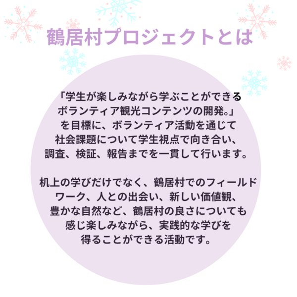 学生、鶴居村、主催者が、互いに、「環境」「社会」「経済」「人との繋がり」においてサスティティナブルなツアーコンテンツの開発を目指して活動しています。さらに、鶴居村での活動を他の学生にも広める情報を発信し、自らが学生をターゲットとした新しい観光形態の先駆けとなることを目標としています。